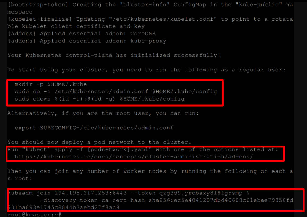 To make kubectl work for your non-root user, run these commands, this is the first highlighted section in the image.