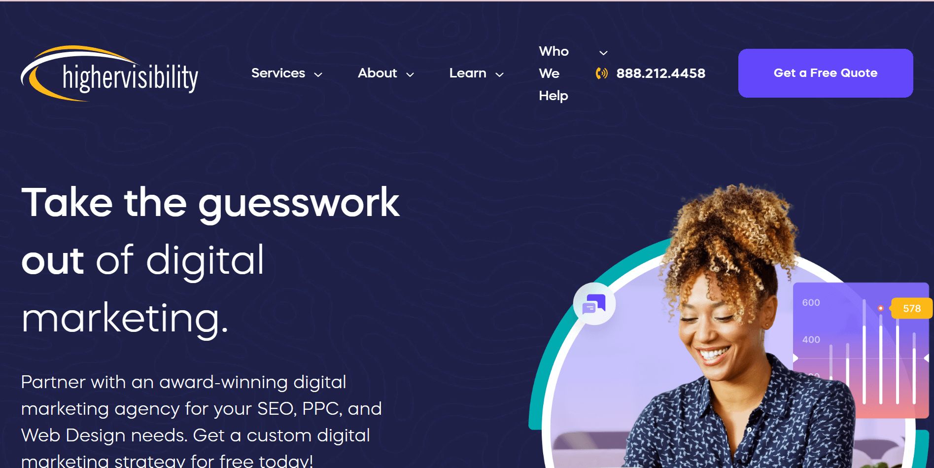 Higher Visibility may also assist you with your SEM requirements. Campaign management, optimized ad text and evaluation, bidding and cost control, competition analysis, geography targeting, and remarketing campaigns are some of the other services provided. HigherVisibility also provides Google Analytics integration, call tracking solutions and analytics goal verification.